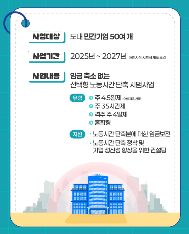 - 사업내용 : 임금 축소 없는 선택형 노동시간 단축 시범 사업