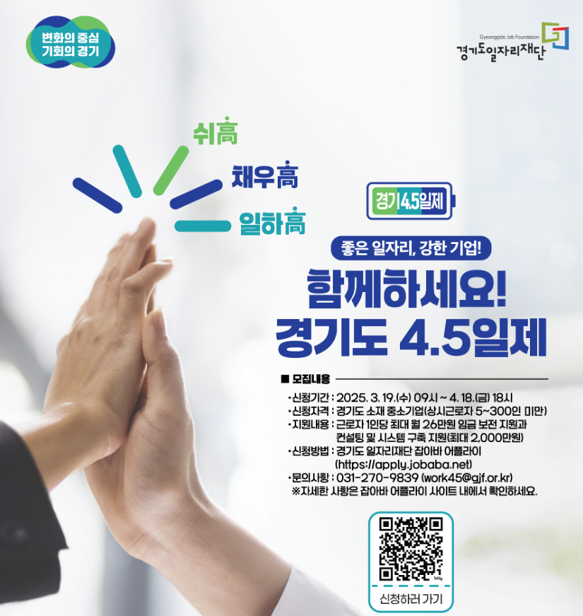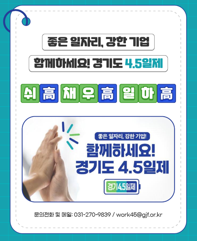 경기도에서 4.5일제 시범사업을 위해 기업 모집에 나섰습니다. 노동시간 단축에 대한 임금보전을 지원하는 내용의 시범사업이라고 하는데요. 사업대상이 되는 기업에서는 지원해 보셔도 좋을듯 합니다.^^